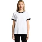 Contrasting ribbing at neck & sleeve hems, side seamed, shoulder to shoulder tape, double needle hems, preshrunk to minimise shrinkage